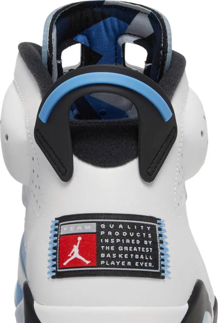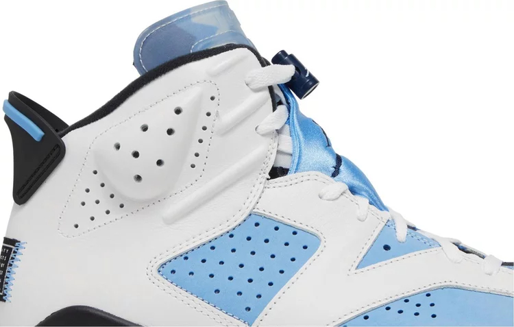 The Air Jordan 6 Retro ‘UNC Home’ features a familiar color combination that pays homage to MJ’s alma mater. The iconic silhouette carries a white leather upper with nubuck underlays in University Blue. Contrasting navy accents make their way to the molded TPU heel tab, textile collar lining and polyurethane midsole, the latter enhanced with visible Air-sole cushioning. Reflective perforations provide added visibility in low-light conditions, while a woven jock tag at the heel nods to the shoe’s varsity athletics theme.