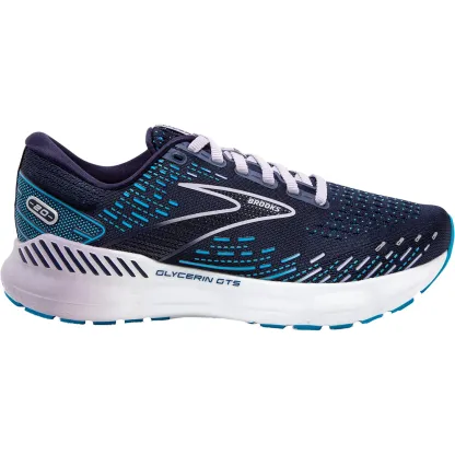 The Brooks Glycerin GTS 20 is a sporty women's road running shoe that offers a secure fit, comfortably holding the foot in place.
